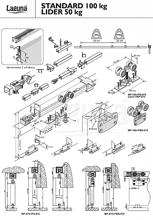 Za namestitev enega vratnega krila morate kupiti samo en komplet s kolesi in vodilom. Za montažo težjega krila lahko uporabite dva kompleta, tj. 1 komplet = 40 kg, dva kompleta = 80 kg itd.
