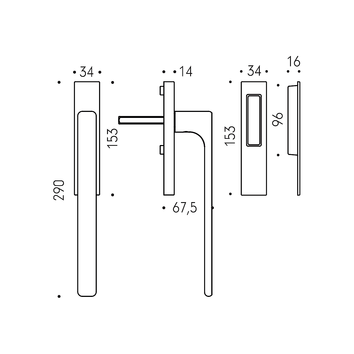 Kvadratna rozeta ima dimenzije 34 mm x 153 mm in debelino 14 mm.