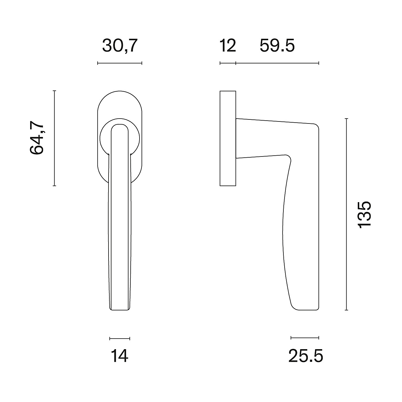 Euro okenska kljuka s kvadratno rozeto je izdelana iz visokokakovostnega zamak materiala - cinkove zlitine in je površinsko obdelana. Rozeta je dimenzij 64,5 x 30 mm in debeline 12 mm.