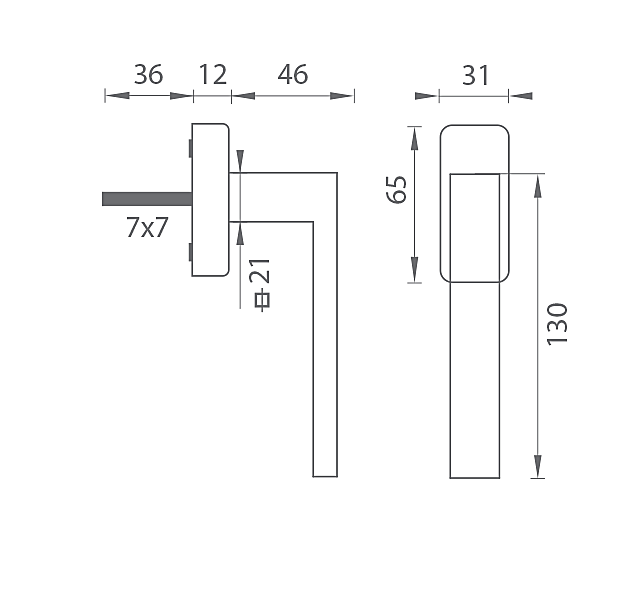 Euro okenski ročaj s kvadratno rozeto je izdelan iz visokokakovostnih materialov - zamaka in je površinsko obdelan. Rozeta ima dimenzije 31 mm x 65 mm in debelino 11 mm.