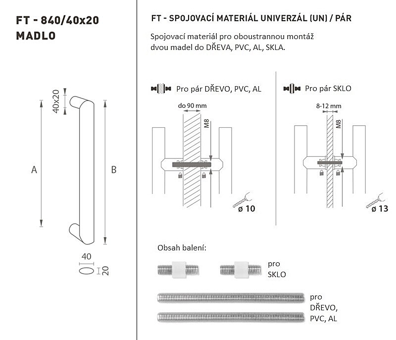 Kljuka vrat je izdelana iz visokokakovostnega nerjavečega jekla, znanega kot inox, in je površinsko obdelana. Profil kljuke je 40 x 20 mm. Komplet UNIVERSAL (UN) vsebuje pritrdilne elemente za dvostransko montažo dveh kljuk v les, PVC, AL, steklo.