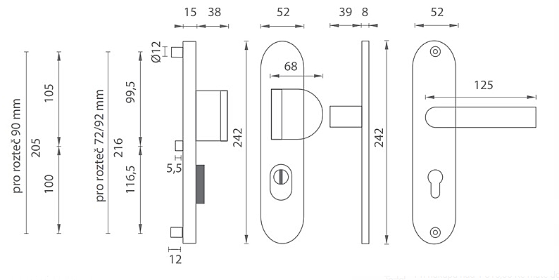Pri varnostnem okovju morate poznati razdaljo med osjo ročaja in osjo ključa (razmak). Standardna razdalja je 72, 90 ali 92 mm. Okovje z razmakom 72 in 90 mm je standardno za debeline vrat od 38 mm do 50 mm. Okovje z razmakom 92 mm je standardno za debeline vrat od 68 mm do 78 mm.