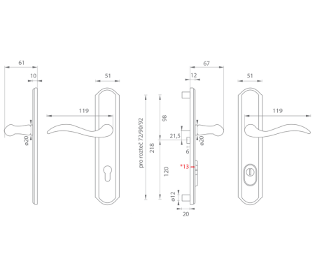 Pri ojačanem okovju je treba poznati razdaljo med osjo ročaja in osjo ključa (naklon). Standardna razdalja je 72, 90 ali 92 mm. Okovje je standardno za debeline vrat od 38 mm do 50 mm.