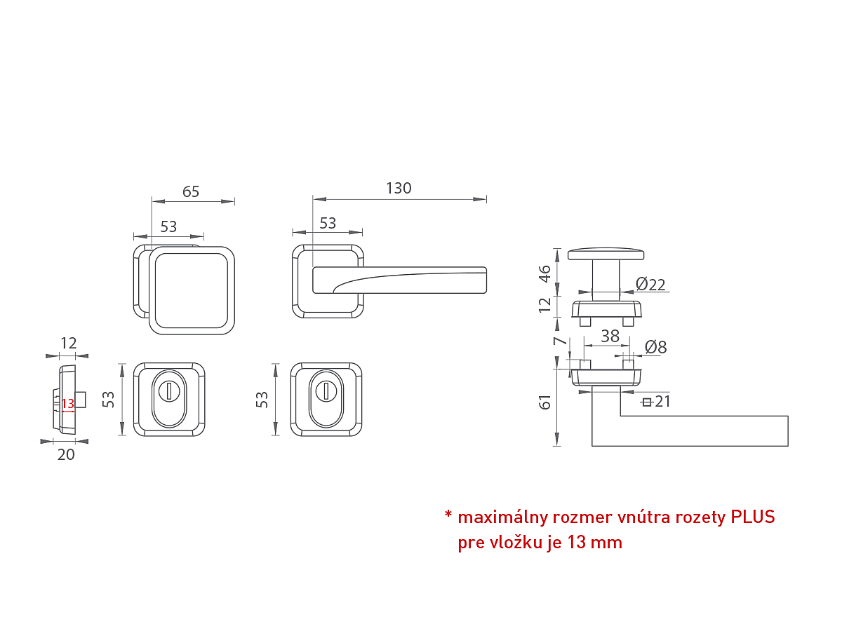 Rozetni ročaj za vhodna in protivlomna vrata z ojačano kvadratno rozeto s cilindričnim pokrovom je izdelan iz visoko kvalitetnih materialov - medenine in je površinsko obdelan. Kvadratna rozeta meri 53 mm x 53 mm in je debela 12 mm.