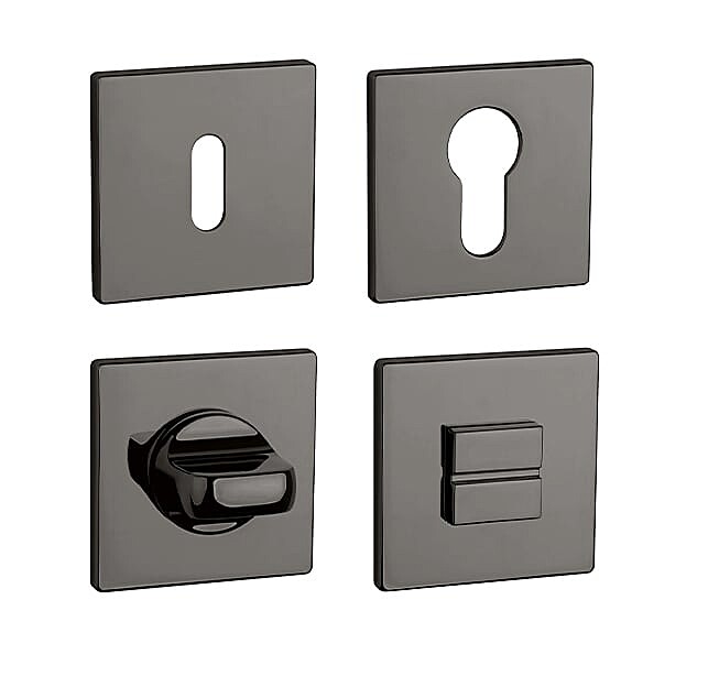 Rozeta ima dimenzije 52x52 mm, debelino 5 mm in ovalno luknjo za notranji ključ (BB), luknjo za cilindrični vložek (PZ), straniščni komplet z vgrajenim ključem.