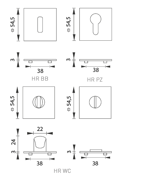 Ovalna luknja za notranji ključ (BB), luknja za cilindrični vložek (PZ) ali WC komplet z vgrajenim ključem. Paket vsebuje 2 rozeti (par), WC rozete pa so pakirane kot komplet.