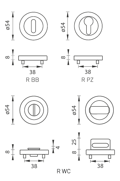 ovalna luknja za notranji ključ (BB), luknja za cilindrični vložek (PZ) ali WC komplet z vgrajenim ključem.