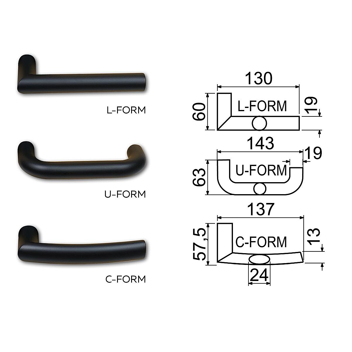 - Ročaj je standardno dobavljen v obliki črke "C", po potrebi pa je lahko dobavljen tudi v obliki črke "L" ali "U".