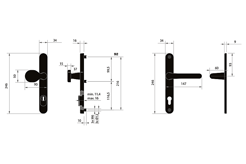 Pri varnostnem okovju morate poznati razdaljo med osjo kljuke in osjo ključa (razmak). Standardna razdalja je 72, 90 ali 92 mm. Okovje je standardno za debeline vrat od 65 do 75 mm.