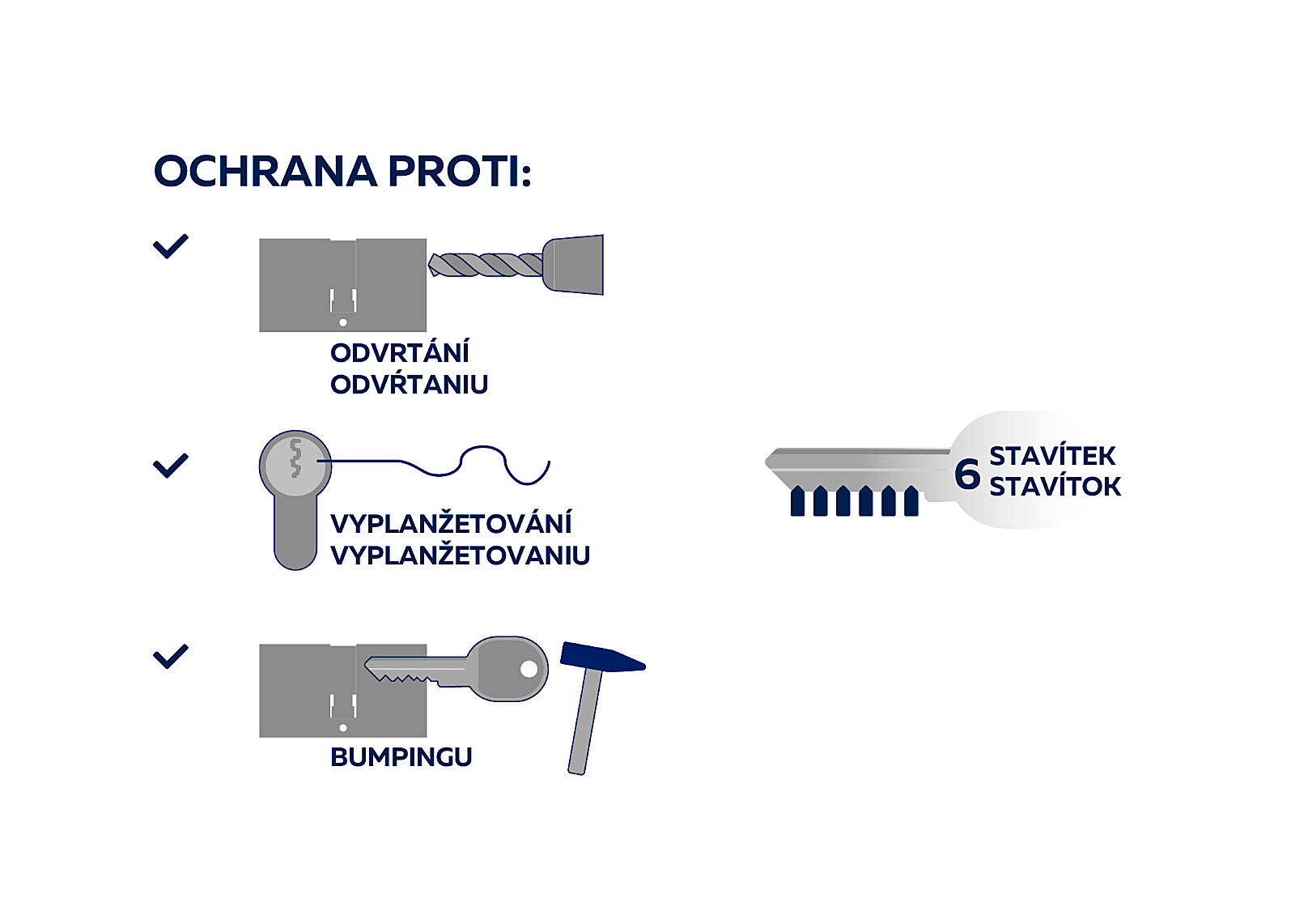 - Zaščita pred vrtanjem s 6 elementi iz kaljenega jekla. Sestavljena je iz 5 zatičev in 1 zatiča.