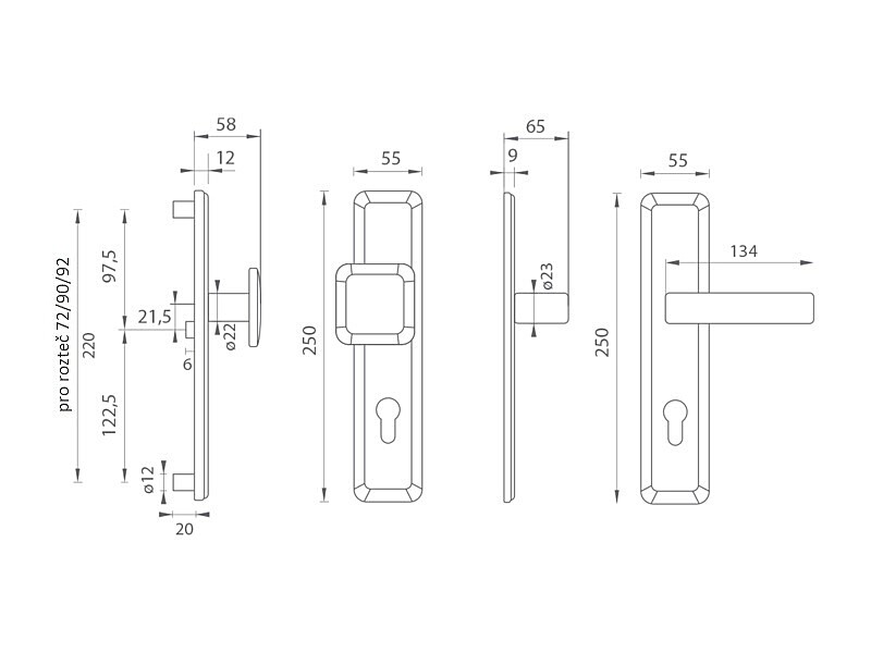 Ščit ročaj za vhodna in protivlomna vrata z ojačanim kvadratnim ščitom brez prepleta cilindričnih vložkov je izdelan iz visoko kakovostnih materialov - medenine in je površinsko obdelan. Pravokotni ščit ima dimenzije 55 mm x 250 mm in debelino 12 mm.
